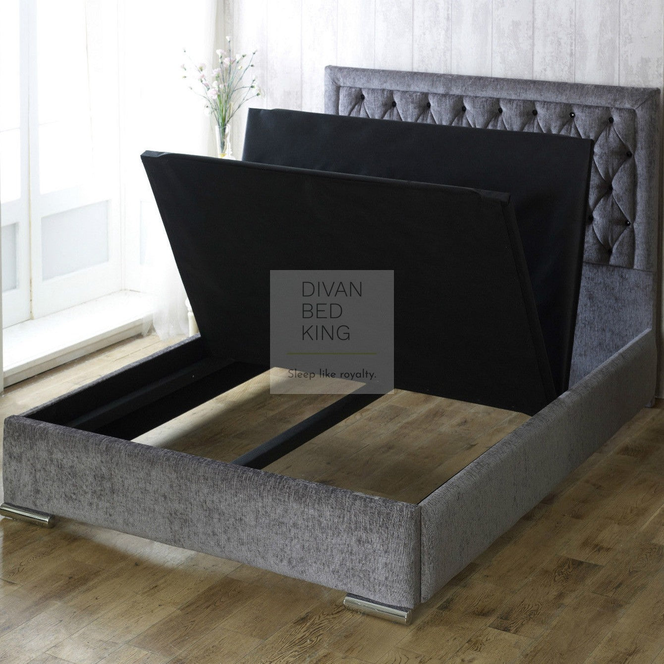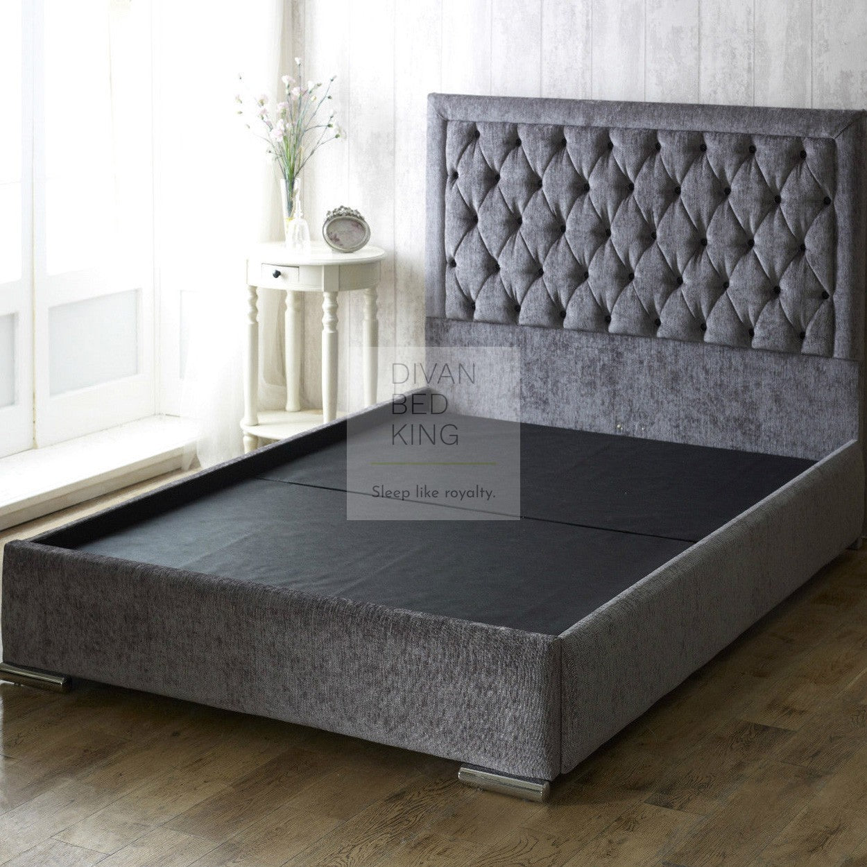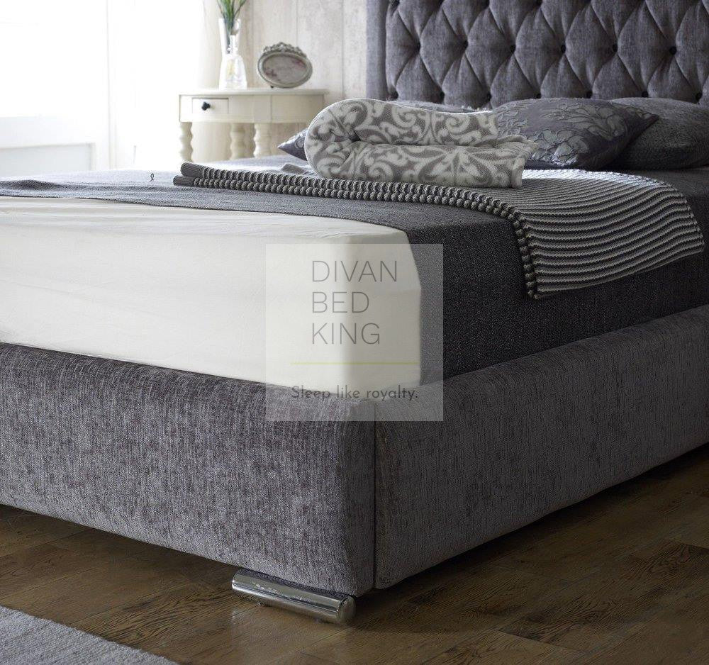 • Bed In Image Is: Charcoal Chenille with Matching Colour Fabric Buttons with Foldable Baseboard